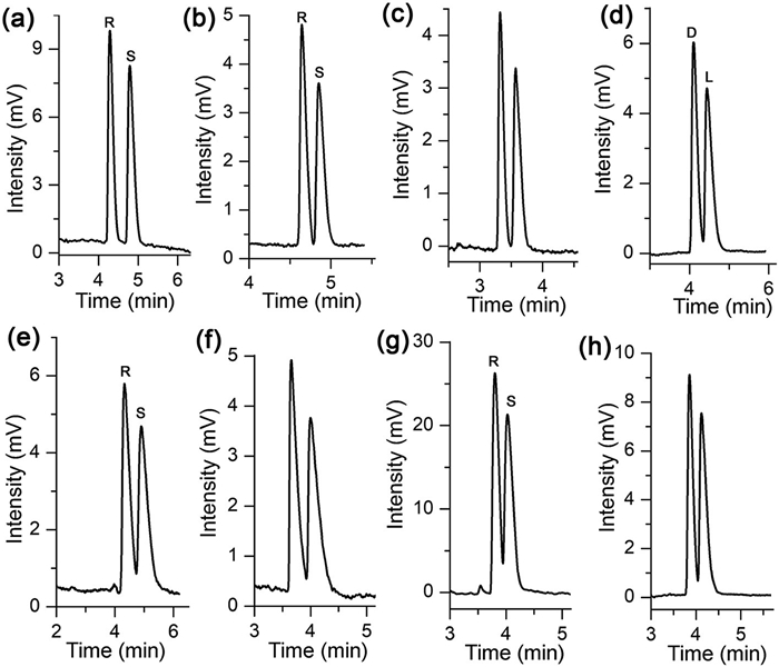 Figure 8.  Representative chromatograms of resolution of racemates on the GC column. (a) γ-Hexalactone, (b) β-butyrolactone, (c) γ-heptalactone, (d) methyl 2-bromopropionate, (e) 2-pentanol, (f) γ-valerolactone, (g) 1-phenylethanol acetate, (h) 2-bromobutanoic acid ethyl ester.