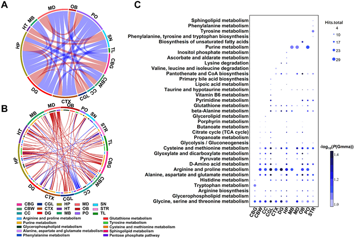 Figure 3.  Metabolic correlation and differential analysis between brain regions. (A) Correlation circos plot of different brain regions. (B) Metabolite-metabolite correlation circos plot of different brain regions. (C) Bubble plot of differential pathways in different brain regions.
