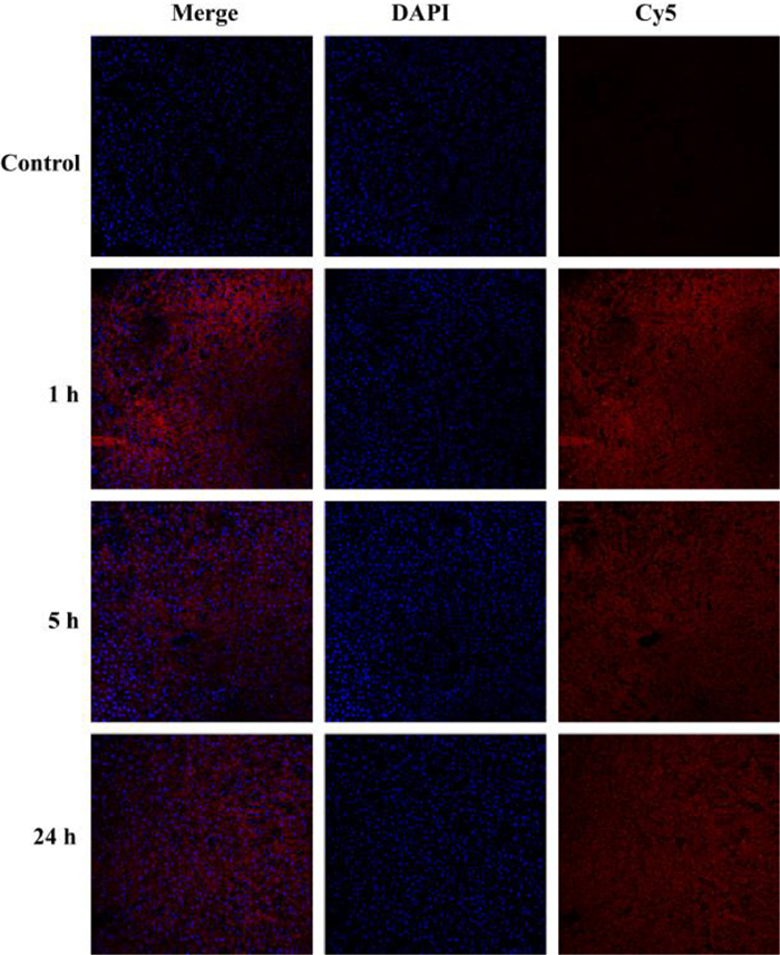 Figure 1.  Fluorescent confocal microscopy images of mouse liver treated with or without EU for different time. Control: mouse without EU injection. The tissues were co-stained with DAPI (20 µL, blue) and Cy5-N3 (10 µmol/L, red) as nucleus and EU markers, respectively.