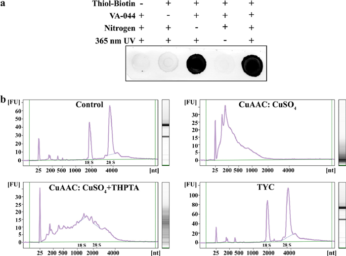 Figure 2.  (a) Dot blot analysis of RNA biotinylation by the thiol-yne reaction. (b) Characterization of the RNA integrity after alkyne labeling (control), CuAAC withount/with ligand (THPTA) and the thiol-yne reaction.