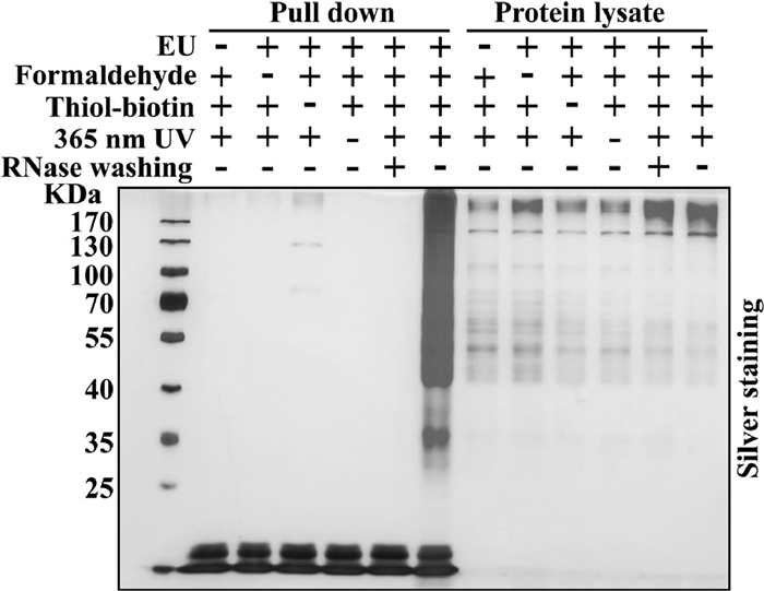 Figure 3  SDS-PAGE characterization of enriched cRPCs from mouse liver. After EU labeling and formaldehyde crosslinking, the tissue lysates were reacted with biotin-PEG11-SH via thiol-yne reaction and enriched with streptavidin beads. The captured cRPCs were eluted by RNase A, resolved by SDS-PAGE and visualized by silver staining.