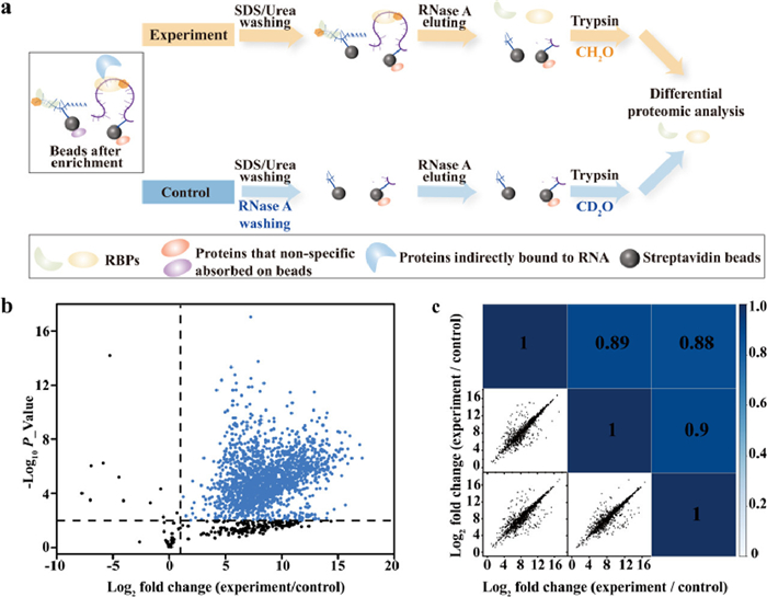 Figure 4.  (a) Schematic overview of the quantitative differential proteome comparison between the experimental and control groups. (b) Volcano plot displaying the log2fold_change and -log10P_value of the RBPs in the quantitative differential analysis. (c) Quantitative reproducibility of the identified RBPs.
