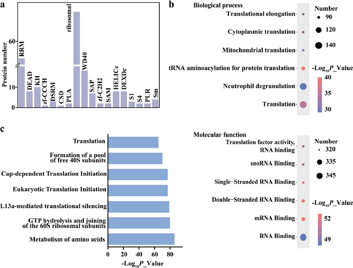 Figure 5  (a) Number of RBPs with different RBDs. (b) GO analysis of identified RBPs. Up: Biological process; Down: Molecular function. (c) Pathway analysis of identified RBPs.