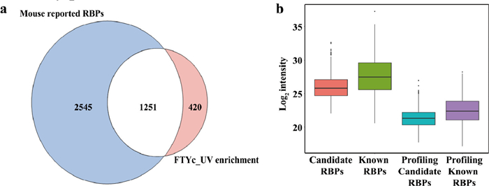 Figure 6  (a) Venn diagram comparing the FTYc_UV identified RBPs and RBPs obtained by other enrichment methods. (b) Box plots of the intensity of the candidate and reported RBPs obtained by FTYc_UV-enrichment and proteome profiling in the mouse liver.