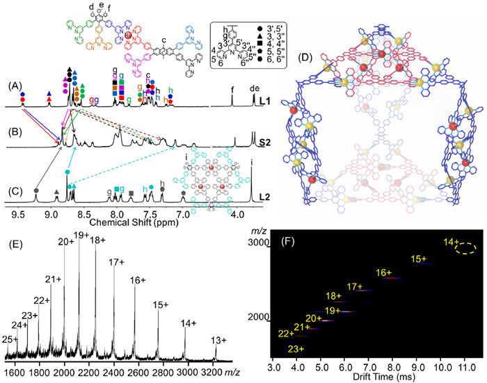 Figure 3  1H NMR spectra (500 MHz, 298 K) of (A) L1 in CD3CN, (B) S2 in CD3CN, and (C) L2 in DMSO–d6. (D) Simulated structure of S2. (E) ESI-MS spectrum and (F) TWIM-MS plot of S2.