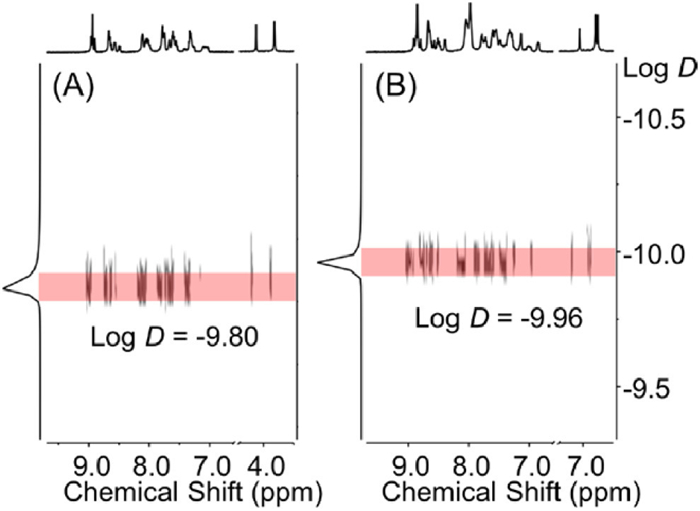 Figure 4.  DOSY spectra (500 MHz, 298 K) of (A) S1 and (B) S2 in CD3CN.