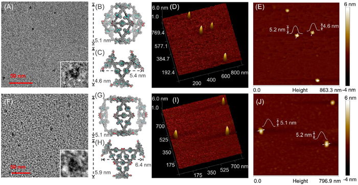 To give an insight to the detail size and height information of S1 and S2, DOSY NMR, transmission electron microscopy (TEM) and atomic force microscopy (AFM) were further conducted. As shown in Fig. 4, the DOSY experiments showed distinct bands at logD = −9.80 (D = 1.58 × 10−10 m2/s) and −9.96 (D = 1.10 × 10−10 m2/s) for S1 and S2, respectively. This demonstrates the formation of sole and discrete species in solution. The TEM samples were prepared by drop-casting of uniformly dispersed S1 and S2 (in MeCN at a concentration of ~10−6) on a super thin-carbon film-coated grid (Cu, 300 mesh). As shown in Figs. 5A and F, the TEM images of S1 and S2 revealed individual particles with an averaged measured diameter of 5.0 ± 0.2, and 6.2 ± 0.2 nm, which were comparable to the geometry-optimized structure of S1 (Figs. 5B and C) and S2 (Figs. 5G and H). In the AFM images of S1 (Figs. 5D and E), a series of dots with height within a certain range (4.6–5.2 nm) were observed on the mica surface, which were in accordance with the different placement forms of S1. AFM images of S2 (Figs. 5I and J) show a series of dots with heights narrowly distributed between 5.1 nm and 5.2 nm on the mica surface, corresponding to the height of the simulated structure of triangular prism S2.