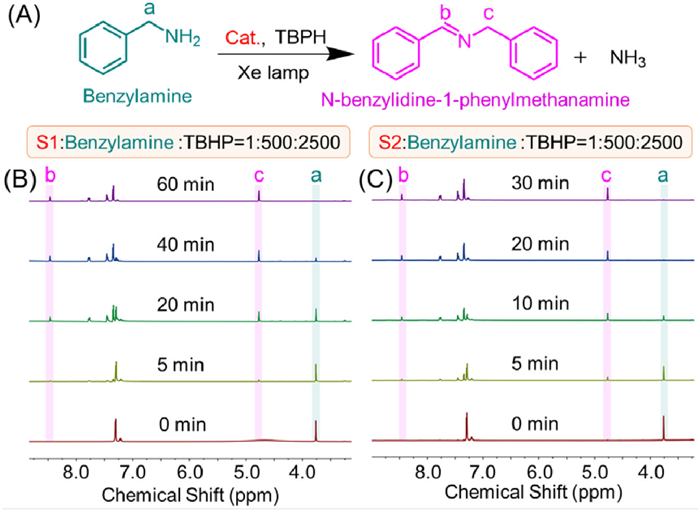 Figure 6  (A) Schematic representation of the catalytic oxidation process of benzylamines to form N-benzylidine-1-phenylmethanamine. 1H NMR spectra (500 MHz, 298 K, CD3CN) of the benzylamine photocatalytic oxidation reaction of catalyzed by (B) S1 and (C) S2, respectively.