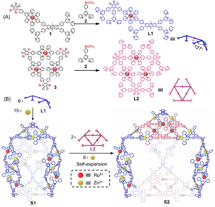 Scheme 1.  The synthesis routs of (A) metallo-organic ligands L1 and L2. (B) Self-assembly of triangular prism S1 and expanded Sierpiński triangle-faced triangular prism S2.