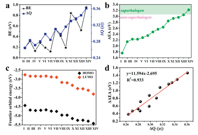 Figure 1.  The calculated (a) BEs and ΔQ of the inner-core clusters, (b) AEA values, (c) energy levels of the frontier MOs, and (d) relationship between the ΔAEA and ΔQ in PAl12(BLAs) clusters.