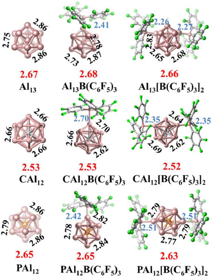 Figure 2.  Ground state structures of MAl12[B(C6F5)3]n (M = Al, C, and P; n = 0–2). Selected Al-Al bond lengths (in Å) are shown in black, the average bond lengths of interior M atom to surface Al atoms are given in red, while the Al-B bond lengths are given in light blue.