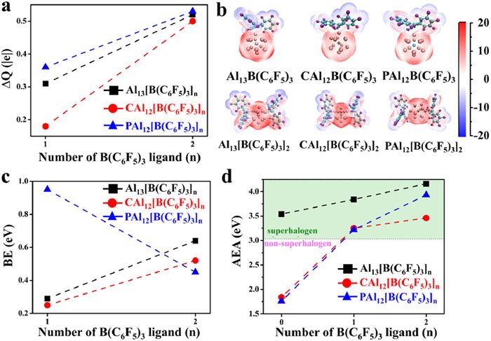 Figure 3.  Calculated (a) accumulated charge of the MAl12 metallic cores, (b) electrostatic potential, (c) binding energies, and (d) AEA of MAl12[B(C6F5)3]n (M = Al, C, and P; n = 0–2) clusters.