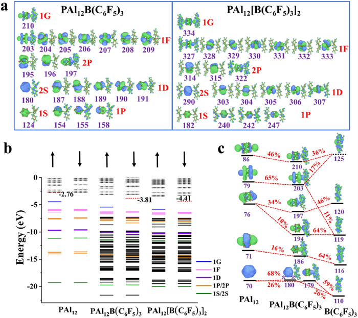 Figure 4  Theoretical (a) isosurface maps of the α occupied MOs of PAl12[B(C6F5)3]n (n = 1–2), the capital letters and numbers in red signify the angular momentum quantum number and the principal quantum number of the superatom, respectively, (b) one-electron energy levels of PAl12[B(C6F5)3]n (n = 0–2) clusters. The occupied and unoccupied states are represented by solid and dashed lines. The red dashed lines indicate the LUMOs. The levels are also marked with their angular character, (c) CDA analysis of PAl12B(C6F5)3 with PAl12 and B(C6F5) as fragments, the numbers marked beside the red lines indicate the contribution from the fragmental MO to the MOs of PAl12B(C6F5)3. The purple numbers in (a) and (c) indicate the orbital numbers. States marked with star symbol in (c) present the anti-bonding states. All the isosurface graphs are plotted with an isosurface value of 0.02.