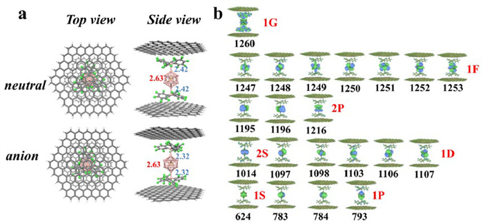 Figure 5  (a) The optimized geometries of the neutral and anionic PAl12[B(C6F5)3]2@graphene. The average bond lengths (in Å) of interior P atom to surface Al atoms are given in red text, while the Al-B bond lengths are given in light blue text, and (b) isosurface maps of the occupied MOs of PAl12[B(C6F5)3]2@graphene, where the capital letters and numbers in red signify, respectively, the angular momentum quantum number and the principal quantum number of the superatom.