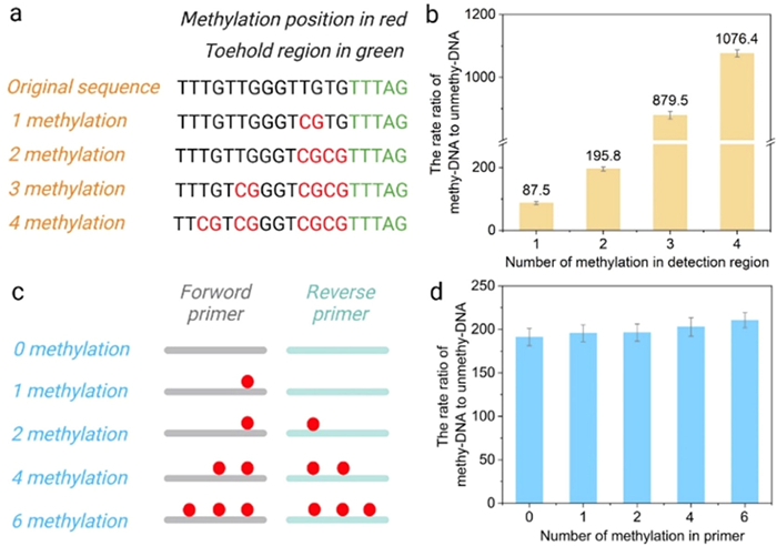 In recent years, biological detection technology has been greatly developed, and more and more advanced technologies are being used to detect various biomarkers [10-15]. So far, scientists have proposed a variety of methods for detecting DNA methylation. These techniques can be roughly divided into as follows: bisulfite conversion based-methods [16], methylation-sensitive restriction endonucleases based-methods (MSRE) [17], bisulfite-free direct detection method [18], and new biosensor methods [19]. Among them, the method based on sodium bisulfite conversion is considered the gold standard for DNA methylation detection. Its principle is to use bisulfite to convert unmethylated cytosine (C) in the DNA sequence into uracil (U), while methylated cytosine remains unchanged [16]. Bisulfite sequencing polymerase chain reaction (PCR) (BSP) is a simple and rapid method that can provide verification results [20]. However, due to the presence of allele mixing and heterogeneous methylation patterns in the DNA sequence, the sequencing results can be very noisy. More importantly, methylated C only make up 0.1% of the total DNA bases [21], therefore the sensitivity of BSP cannot meet the clinical needs for early cancer screening. PCR is the most common and stable method of DNA amplification and can effectively increase the concentration of the target nucleic acid [22]. Methylation-specific PCR (MSP) and Methylight can quantify the methylated or unmethylated state of the sequence [23]. However, their primers are complicated, usually involving several methylation sites, which leads to complex and cumbersome detection system design. In addition, their sensitivities are not high enough [24]. MSRE uses enzyme to digest unmethylated DNA without requiring complicated chemical treatments or expensive sequencing equipment [25]. However, only a few MSREs are currently available, which cannot be used for large-scale screening of DNA methylation sites. In addition, incomplete digestion of unmethylated DNA by MSRE may lead to false positives [26]. Bisulfite-free direct detection methods, such as ten-eleven translocation (TET)-assisted pyridine borane sequencing (TAPS), face challenges related to limited conversion efficiency and insufficient detection sensitivity [18]. These issues constrain their broader application and adoption. In recent years, a variety of novel biosensing technologies have been developed for DNA methylation detection, such as electrochemistry [27], colorimetry [28] and Raman spectroscopy [19]. However, these methods are expensive, operationally complex and require professional training, which is not conducive to large-scale clinical promotion [29]. Therefore, there is an urgent need to develop an easy-to-use, fast, highly sensitive and specific quantitative method for DNA methylation detection to provide an effective clinical means for early cancer diagnosis and prognosis evaluation.