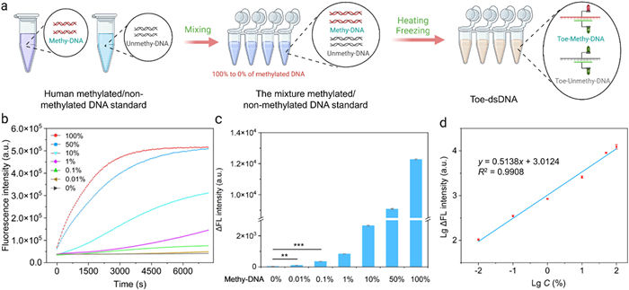 Figure 4.  Analysis of sensitivity and specificity of this method for DNA methylation detection. (a) Schematic diagram of our method to detect mixed samples of different proportions. (b) Fluorescence curve of four methylation sites in ACP methylated standard detecting by our method. (c) Statistical analysis of four methylation sites in ACP methylated DNA standard. (d) Relationship between the rise rate of the fluorescence intensity and the concentration of ACP. LgΔFL intensity means the logarithm of the rise rate of the fluorescence intensity. LgC means the logarithm of target concentration. Student's t-tests. ns, P > 0.05; *, P < 0.05; **, P < 0.01; ***, P < 0.001. n = 3.