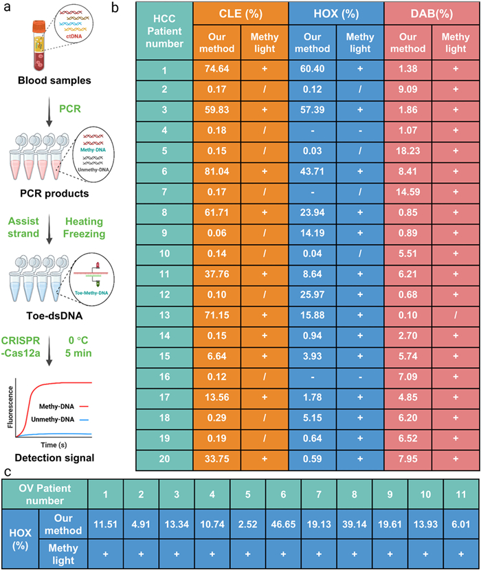 Figure 5  (a) Schematic workflow for DNA methylation detection in real clinical samples by our method. (b) Comparison of the abundances of CLE, HOX and DAB methylation in 20 HCC samples reported by our method and Methylight. (c) Comparison of the abundances of HOX mutation in 11 ovarian cancer samples reported by our method and next-generation sequencing (NGS). + means positive, - means negative, / means no signal detected.