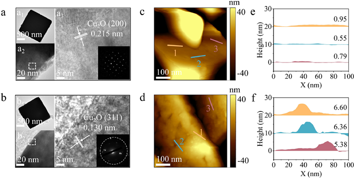 In typical synthesis, the pristine Cu2O nanoparticles were synthesized under alkaline conditions using ascorbic acid as a reductant [24], while CO–Cu2O nanoparticles were prepared following the same procedure under a CO atmosphere. Further details on the experimental section, including materials source and preparation method, can be found in Supporting information. Scanning electron microscopy (SEM) images revealed that the prepared Cu2O and CO–Cu2O nanoparticles exhibited cubic structural morphology with a diameter of about 600 nm (Figs. S1 and S2 in Supporting information). Based on the results of high-resolution transmission electron microscopy (HR-TEM) images, the interplanar spacings have been reduced from 0.215 nm in pristine Cu2O to 0.130 nm in CO–Cu2O (Figs. 1a and b). This indicates that a significant number of (311) crystal planes appear in CO–Cu2O through the self-selective CO-induced strategy. Atomic force microscopy (AFM) images (Figs. 1c and d, Fig. S3 in Supporting information) revealed that the roughness of CO–Cu2O was significantly higher than that of pristine Cu2O because the (311) crystal planes possessing abundant step- and kink- sites [38]. The line profiles (Figs. 1e and f) demonstrated an increase in the height variation on the CO–Cu2O surface compared to that on the Cu2O surface. The average heights of the CO–Cu2O and Cu2O surfaces, determined via line profile extraction analysis, were approximately 6.11 nm and a mere 0.76 nm, respectively. These particulate edges represented undercoordinated sites associated with crystal microfacets, which are considered to play a crucial role in structure-activity relationship [39,40].