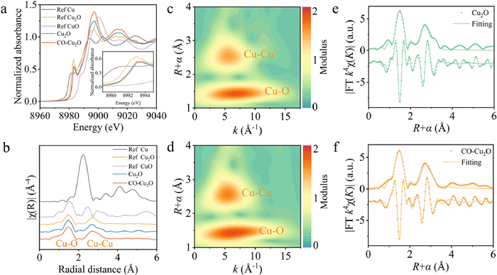 Figure 2  X-ray fine structure analysis. (a) Normalized Cu K-edge XANES spectra. (b) k3-weighted Fourier transform EXAFS spectra without phase correction. Cu K-edge WT-EXAFS contour plots of (c) Cu2O and (d) CO–Cu2O. Fitting of k space and R space of Cu in (e) Cu2O and (f) CO–Cu2O.