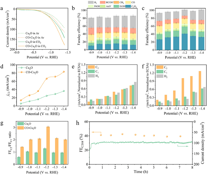 Figure 4.  CO2-to-C2 electroreduction performance. (a) Comparison of LSV for CO2 and Ar-saturated electrolytes. Faradaic efficiency of each product generated with (b) Cu2O and (c) CO–Cu2O at various imposed potentials. (d) The partial current density of C2 products at various potentials over Cu2O and CO–Cu2O. ECSA-normalized current density of different products of (e) Cu2O and (f) CO–Cu2O. (g) The FEC2/FEC1 ratios of Cu2O and CO–Cu2O under various imposed potentials. (h) Stability tests of CO–Cu2O at −1.2 V vs. RHE in 0.5 mol/L KHCO3.