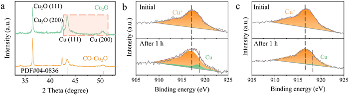 Figure 5.  Cu valence changes in catalysts after CO2 electroreduction. (a) XRD spectra of Cu2O and CO–Cu2O after 1 h of CO2RR at −1.2 V vs. RHE. Cu LMM spectra of (b) Cu2O and (c) CO–Cu2O at initial states and those after 1 h of CO2RR at −1.2 V vs. RHE.