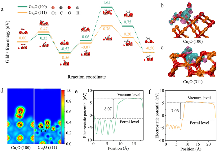 Figure 6  Mechanistic studies by DFT calculations. (a) The free energy diagrams for CO2 reduction to different intermediates on the Cu2O (100) and Cu2O (311) surfaces at U = 0 V. DCD map for the *CO intermediate adsorbed on the (b) Cu2O (100) and (c) Cu2O (311) surfaces. (d) ELF of Cu2O (100) and Cu2O (311). The WF across the (e) Cu2O (100) slab and (f) Cu2O (311) slab vacuum interface.