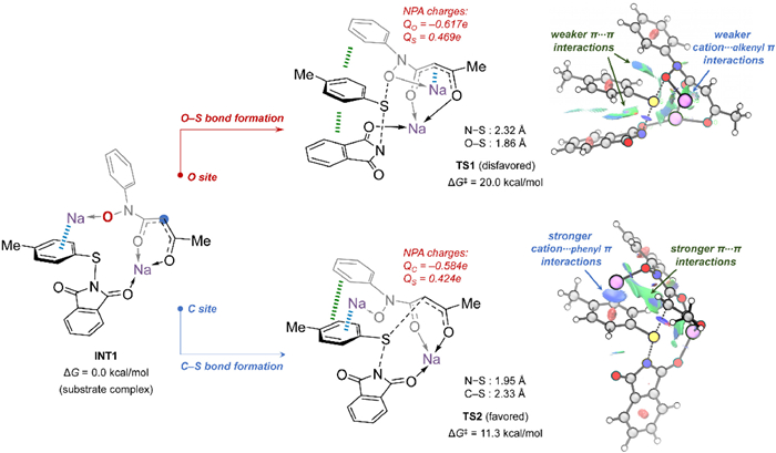 Under basic conditions, while acetyl protected hydroxylamines only have a nucleophilic O site, it is possible for 1,3-dicarbonyl protected hydroxylamines to serve as both O-nucleophile and C-nucleophile. Thus, the SN2 nucleophilic attack is critical for the observed distinguished reaction preference. DFT calculations were further performed to study these base-mediated nucleophilic substitutions of N-thiophthalimides with acetyl protected hydroxylamines and 1,3-dicarbonyl protected hydroxylamines. Since it is straightforward for the nucleophilic substitution between N-thiophthalimides and acetyl protected hydroxylamines (see details in Supporting information), we here focus on the competing O- and C-nucleophilic substitutions between N-thiophthalimides (e.g., 2a) and 1,3-dicarbonyl protected hydroxylamines (e.g., 5a). As shown in Fig. 2, these two reactants can form the complex INT1 via deprotonation in the presence of tBuONa. Subsequently, the nucleophilic substitutions proceed either at the O site (TS1, ΔG = 20.0 kcal/mol) or the C site (TS2, ΔG = 11.3 kcal/mol). The much lower barrier of TS2 than TS1 suggests that the 1,3-dicarbonyl protected group can introduce a more reactive C-nucleophilic site that surpasses the intrinsic O site of hydroxylamines. The NPA charges on the key O, C and S sites were first calculated to understand the origin of this chemoselectivity. However, the positive charges on the sulfur atoms (QS = 0.469e in TS1 vs. QS= 0.424e in TS2) and the negative charges on oxygen and carbon (QO = –0.617e in TS1 vs. QC = –0.584e in TS2) atoms go against the barrier difference between TS1 and TS2, which cannot explain the experimentally observed chemoselectivity. Alternatively, we evaluated the non-covalent interactions in these two transition states. The NCI plots [87,88] show that the Na···π (phenyl) interaction in TS2 (SN2 at the C site) is greater than the Na···π (alkenyl) interaction in TS1 (SN2 at the O site) (Fig. 2). In addition, TS2 also has stronger π···π interactions than those in TS1. The stronger non-covalent interactions in the favored TS2 result in the feature of early transition states, showcasing a shorter N···S distance (1.95 Å) and a longer C···S distance (2.33 Å). In contrast, the disfavored TS1 bears the feature of late transition states, having a longer N···S distance (2.32 Å) and a shorter O···S distance (1.86 Å). These results reveal that the non-covalent interactions introduced by the 1,3-dicarbonyl group play an important role in enabling the observed protecting-group-dependent chemoselectivity.