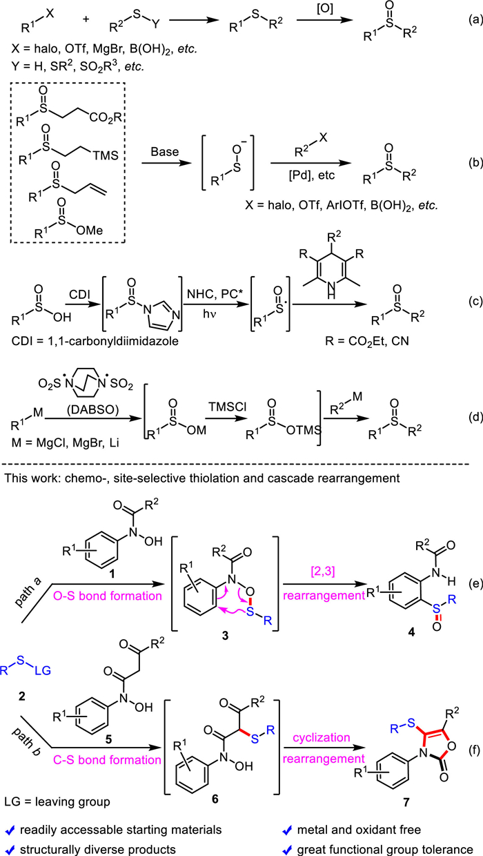 Due to the extensive applications of sulfoxides in many fields, it is not surprising that a large number of methods for the preparation of sulfoxide compounds have been developed in the past few decades [15,3847]. For instance, the direct oxidation of sulfides, which were prepared through a variety of C-S bond formation reactions, is the most common strategy for the synthesis of sulfoxides (Scheme 1a). However, this strategy was suffering from the employment of stoichiometric amounts of oxidant, overoxidation to form sulfone products and the limited functional group compatibility [38,39,4852]. Palladium-catalyzed cross-coupling of sulfenate anions with a variety of halides, triflates, iodonium salts or borons, was found to be an efficient approach for the construction of sulfoxide unit [5367]. Drawbacks of these transformations are the requirement for expensive metal catalysts, ligands and often harsh conditions (Scheme 1b). Recently, a radical pathway from sulfinic acids and four-substituted Hantzsch esters in the presence of N-heterocyclic carbene and photocatalyst to sulfoxides was documented by Wu and Kuang (Scheme 1c) [68]. The sulfoxide moiety could also be prepared from organometallic reagents and DABSO in the presence of trimethylsilyl chloride (Scheme 1d) [69]. Despite these advances, more efficient, environmental-friendly and operationally simple protocols for the synthesis of structurally diverse sulfoxide compounds from readily accessible materials are still in high demand. Herein, we reported a practical and facile approach to ortho-aminoaryl sulfoxides from readily available N-arylhydroxylamines and N-thiophthalimides through a transition metal-free cascade O-thiolation and concerted N-O bond cleavage and [2,3]-sigmatropic rearrangement (Scheme 1e). Furthermore, a series of biologically useful multiple substituted oxazolone derivatives could be efficiently constructed once the protecting-group of N-arylhydroxylamines was switched from acetyl to 1,3-dicarbonyl group under very similar conditions (Scheme 1f).