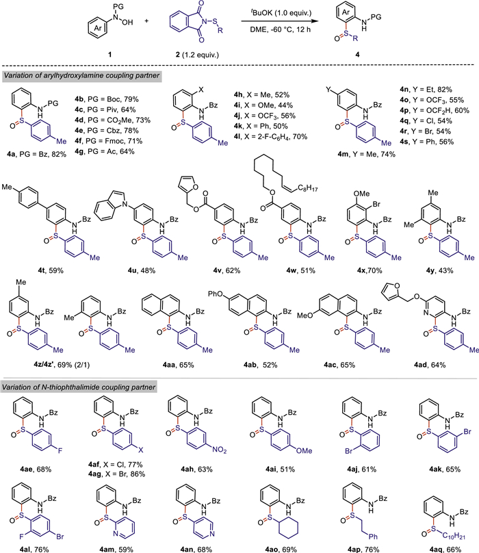 Next, we employed the optimized reaction conditions to evaluate the generality of this cascade protocol (Scheme 2). The substrate scope of N-arylhydroxylamines 1 was first investigated by varifying the protecting group onto the nitrogen atom of the hydroxylamine, and a series of frequently-used acetyl-type protecting groups were well tolerated, giving the corresponding products 4a-4g in moderate to good yields, respectively. The compatibility of different substituents of N-arylhydroxylamines was subsequently examined. The ortho- or para-substituted N-arylhydroxylamines with varied electron-donating groups or electron-withdrawing groups were amenable to this cascade transformation, affording to the corresponding products 4h-4t in modest to high yields. Notably, this optimized conditions successfully promoted the [2,3]-sigmatropic rearrangement of para-substituted N-phenylhydroxylamines with an indole moiety (4u) and ester group carrying a furanyl ring or a long chain alkene (4v-4w), respectively. 2,3-Disubstituted N-phenylhydroxylamine was endurable to the reaction conditions, furnishing the corresponding sulfoxides 4x in 70% yield. The sterically congested products 4y could also be constructed albeit with relatively lower yield. It was not surprising that a mixture of two regioisomers 4z/4z′ were obtained when meta-methyl substituted N-phenylhydroxylamine was employed as substrate. Moreover, a variety of substituted N-naphthylhydroxylamines underwent the desired transformation to afford the corresponding sulfoxide products 4aa-4ac in moderate yields. In addition, N-hydroxybenzamide with pyridine ring structure could also react smoothly with N-thiophthalimide 2a to generate sulfoxide 4ad in 64% yield under the standard conditions.