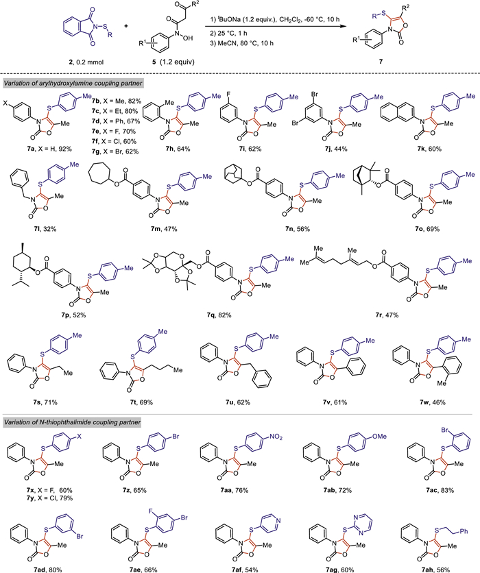 Having the optimized conditions in hand, the scope and generality of this novel cascade reaction was evaluated using structurally diverse N-thiophthalimide 2 to react with N–hydroxy-3-oxo-N-arylbutanamide 5 bearing varied substituents of the aryl ring (Scheme 3). Both electron-donating groups, such as alkyl groups, and electron-withdrawing groups, such as halogens, could be efficiently introduced onto the aryl ring of N-arylhydroxylamine, leading to the corresponding oxazolone products 7a-7j in moderate to good yields. N-Naphthylhydroxylamine was tolerated and readily produced 60% yield of 3,4,5-trisubstituted oxazolone 7k under standard conditions. Gratefully, N-benzylhydroxylamine was also compatible with this system, albeit with relatively lower yield of the desired product 7l. Furthermore, N-arylhydroxylamines connected with natural product skeletons, such as cycloheptanol, 2-adamantanol, fenchol, menthol, diacetonefructose and geraniol, were also amenable to this cascade protocol, providing the corresponding products 7m-7r in moderate to good yields. Interestingly, the substituent R2 of the carbonyl group could also be diversified into ethyl, butyl, benzyl and aryl groups, generating the desired oxazolone products 7s-7w in 46%−71% yields under optimal conditions.