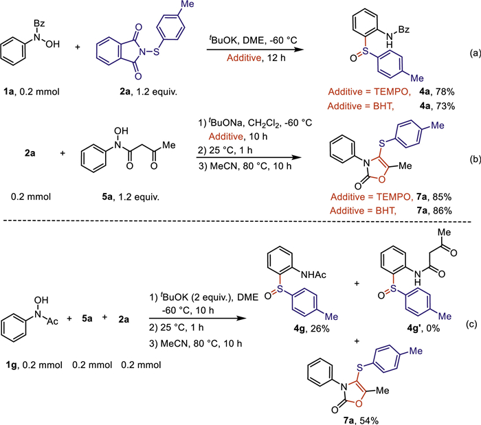 To gain some mechanistic insight of both cascade reactions, we set up two control experiments with TEMPO and BHT as inner additives under their standard conditions, which still afforded the corresponding products 4a and 7a in good yields, respectively (Schemes 4a and b). As a result, the radical pathways might be ruled out in both transformations. In addition, we conducted a competition experiment by employing N-thiophthalimide 2a to react with acetyl protected N-phenylhydroxylamine 1g and 1,3-dicarbonyl protected N-phenylhydroxylamine 5a, generating the expected sulfoxide product 4g in 26% yield and 3,4,5-trisubstituted oxazolone 7a in 54% yield without the formation of 4g′ (Scheme 4c). This result indicated that the reaction between 2a and 5a was relatively faster and easier than the reaction between 2a and 1g.