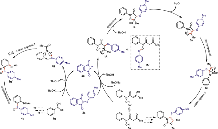 Based on the aforementioned experimental results, we proposed the mechanistic hypotheses for both cascade reactions. As shown in Scheme 5, acetyl protected N-phenylhydroxylamine 1g reacted smoothly with N-thiophthalimide 2a in the presence of tBuOK through nucleophilic substitution reaction (SN2) to generate the O-thiolated intermediate 3g, which underwent the subsequent [2,3]-sigmatropic rearrangement and re-aromatization to afford the final sulfoxide product 4g.