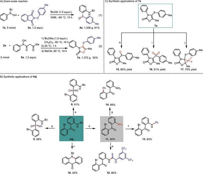 To demonstrate the reaction potential of these two types of cascade protocols, the large-scale reactions were conducted under standard conditions, both of which could obtain the corresponding adducts in good yields, respectively (Scheme 6A). To evaluate the synthetic applications of the outcome from both cascade reactions, diarylsulfoxide compound 4aj and aryl oxazolone 7a were selected as representatives and were converted into diverse functional molecules under various conditions (Schemes 6B and C). Diarylsulfoxide 4aj could be efficiently oxidated by meta-chloroperbenzoic acid (m-CPBA) to generate sulfone 8 in excellent yield (Scheme 6B, path a) [89]; the treatment of diarylsulfoxide 4aj with sodium azide in the presence of concentrated sulfuric acid afforded sulfoximine 9 in 58% yield (Scheme 6B, path b) [90]; copper-catalyzed intramolecular cyclization/C-N bond formation of diarylsulfoxide 4aj could be accomplished to furnish (5-oxido-10H-phenothiazin-10-yl)(phenyl)methanone 10 in 42% yield (Scheme 6B, path c) [91]; the protecting-group onto the nitrogen atom of diarylsulfoxide 4aj could be efficiently removed in the presence of hydrazine hydrate at 100 ℃ to obtain 2-((2-bromophenyl)sulfinyl)aniline 11 (Scheme 6B, path d) [92], which could be further transformed into 1-(3,5-bis(trifluoromethyl)phenyl)-3-(2-((2-bromophenyl)sulfin-yl)-phenyl)-thiourea 12 in excellent yield by the treatment with 1-isothiocyanato-3,5-bis(trifluoromethyl)benzene at room temperature (Scheme 6B, path e) [93], 2-((2-bromophenyl)sulfinyl)-N-phenylaniline 13 in 83% yield through the Cu(OAc)2-mediated Chan-Lam CN coupling with phenylboronic acid (Scheme 6B, path f) [94], and 2-([1,1′-biphenyl]−2-ylsulfinyl)aniline 14 via palladium-catalyzed Suzuki coupling with phenylboronic acid (Scheme 6B, path g) [95], respectively. In addition, 5-methyl-3-phenyl-4-(p-tolylthio)oxazol-2(3H)-one 7a could be chemoselectively oxidized into the corresponding sulfoxide 15 or sulfone 16 with good yields in the presence of different equivalents of meta-chloroperbenzoic acid, respectively (Scheme 6C, path h and path i) [96,97]; the C=C bond of 7a could undergo difluoromethylation with TMSCF3 and sodium iodide to gain 6,6-difluoro-1-methyl-4-phenyl-5-(p-tolylthio)-2-oxa-4-azabicyclo[3.1.0]hexan-3-one 17 in 75% yield (Scheme 6C, path j) [98].