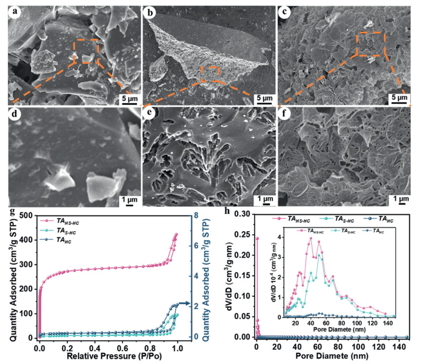 Figure 1.  Morphological and structural characterization of TAs. SEM of (a, d) TAHC, (b, e) TAS-HC, and (c, f) TAHS-HC, nitrogen adsorption and (g) desorption isotherms, (h) pore size distribution curves of TAs.