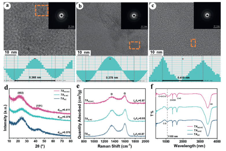 Figure 2.  Structural analysis of TAs. HRTEM and the corresponding SAED and FFT modes are displayed at the bottom of (a) TAHC, (b) TAS-HC and (c) TAHS-HC, (d) XRD patterns, (e) Raman spectra, (f) FTIR spectra of TAs.