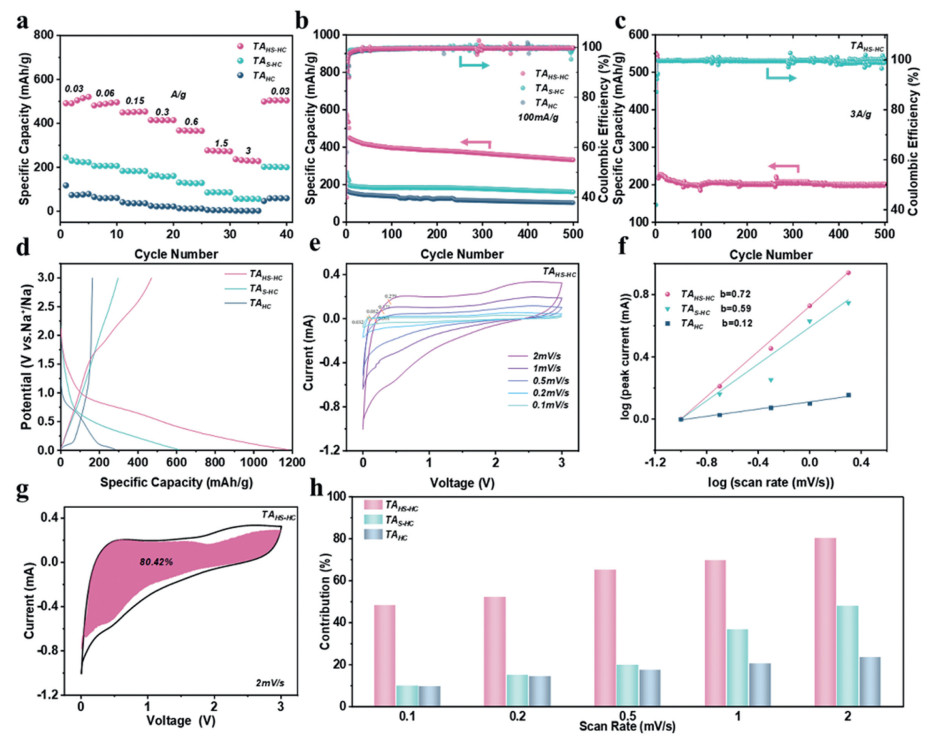 Figure 3.  The comparison of electrochemical performance among TAs. (a) Rate performance. (b) Cycle performance at 100 mA/g current density. (c) Cycle performance of TAHS-HC at 3 A/g current density. (d) First cycle diagram. (e) CV curves at different scan rates of TAHS-HC. (f) b value calculated based on the relationship between CV peak current and scan rate. (g) Pseudocapacitive ratio of TAHS-HC at 2 mV/s scan rate. (h) Pseudocapacitive ratio bar graph at different scan rates.