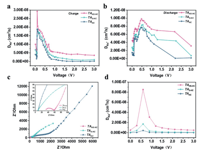 Figure 4.  Electrochemical analysis of TAs: (a) Ion diffusion coefficient during discharging calculated based on GITT. (b) Ion diffusion coefficient during charging process. (c) EIS. (d) Ion diffusion coefficient calculated based on EIS.