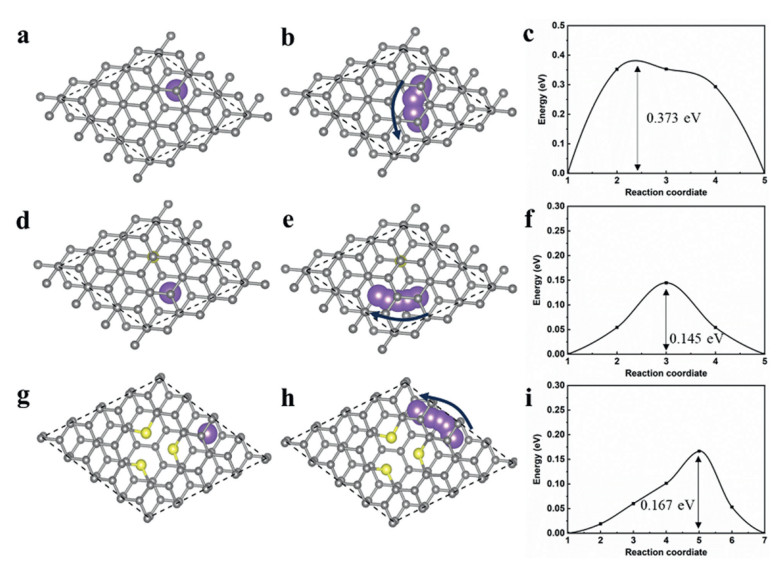 Figure 5.  Migration path and migration barrier of Na+ in TAs. Na+ initial position, migration path, migration barrier in (a-c) initial carbon layers, (d-f) S1 site carbon layers, (g-i) S3 site carbon layers, yellow cycle as S, purple ball as Na+, arrow as mobile direction of Na+.