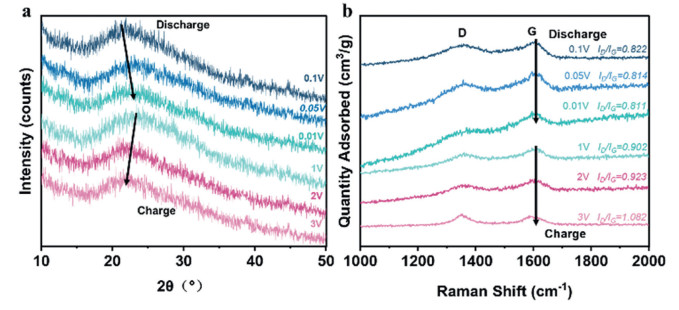 Figure 6.  Structural characterization of TAHS-HC during charge and discharge. (a) XRD patterns. (b) Raman spectra.