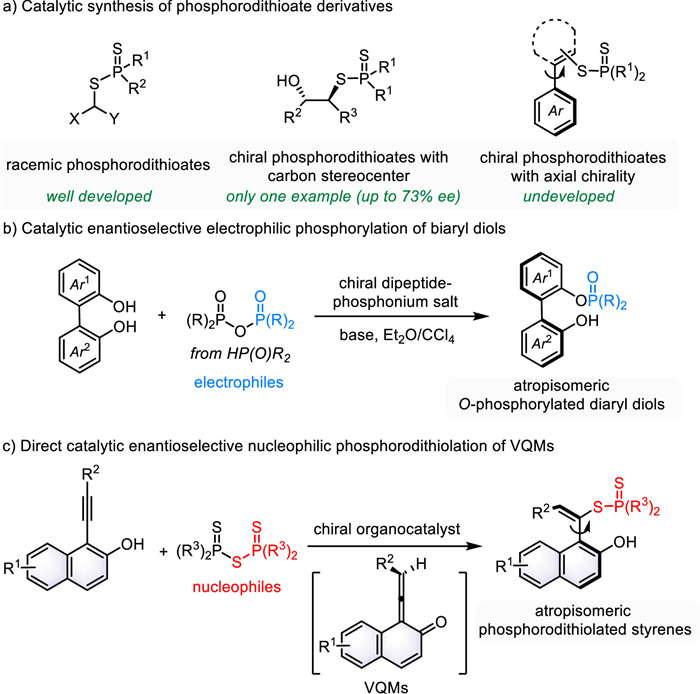 • Organophosphorodithioates have a wide variety of applications in pharmacy [1-4], agrochemistry [5-8], materials chemistry [9,10] and synthetic chemistry [11,12]. Consequently, great effort has been devoted to the development of efficient methods for the construction of organophosphorodithioates and related derivatives in recent years (Fig. 1a) [13-18]. Enantioselective preparation of organophosphorodithioates mainly relied on asymmetric induction approaches began with stoichiometric amounts of chiral auxiliaries [19-28]. The emerging P(Ⅴ)-based phosphorylation protocol developed by Baran et al. provided a robust synthetic strategy for stereocontrolled synthesis of chiral phosphorodithioate derivatives with P-stereogenic centers by using limonene-derived chiral oxathiophospholane reagents [19,22-28]. Nevertheless, the catalytic asymmetric reaction for accessing chiral organophosphorodithioates was exclusively explored via (salen)Ti(Ⅳ)-catalyzed asymmetric ring opening of epoxide with dithiophosphorus acid, but unfortunately the enantioselective control of carbon stereocenter remains challenging (up to 73% ee) [29]. Furthermore, the direct catalytic asymmetric approach toward axially chiral phosphorodithioates has never been reported.