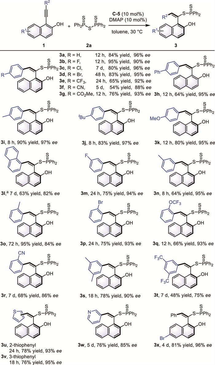 Figure 2.  Scope of o-alkynylnaphthols. Reaction condition: 1 (0.15 mmol), 2a (46.6 mg, 0.1 mmol), C-5 (6.3 mg, 10 mol%), DMAP (1.2 mg, 10 mol%), toluene (2 mL), 30 ℃. The enantiomeric excesses were determined by HPLC on a chiral stationary phase. a 20 mol% C-5, 20 mol% DMAP.