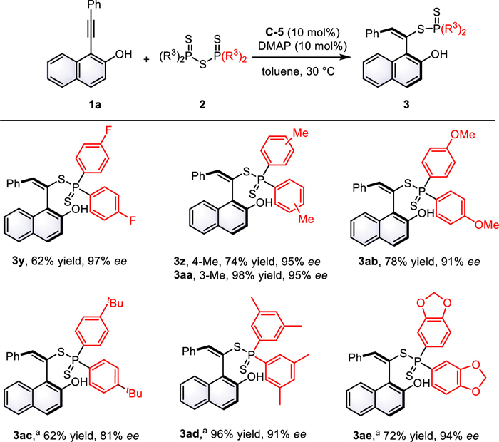 Figure 3  Scope of phosphinothioic thioanhydrides. Reaction condition: 1a (36.6 mg, 0.15 mmol), 2a (0.1 mmol), C-5 (6.3 mg, 10 mol%), DMAP (1.2 mg, 10 mol%), toluene (2 mL), 30 ℃, 12 h. The enantiomeric excesses were determined by HPLC on a chiral stationary phase. a 20 mol% C-5, 20 mol% DMAP.