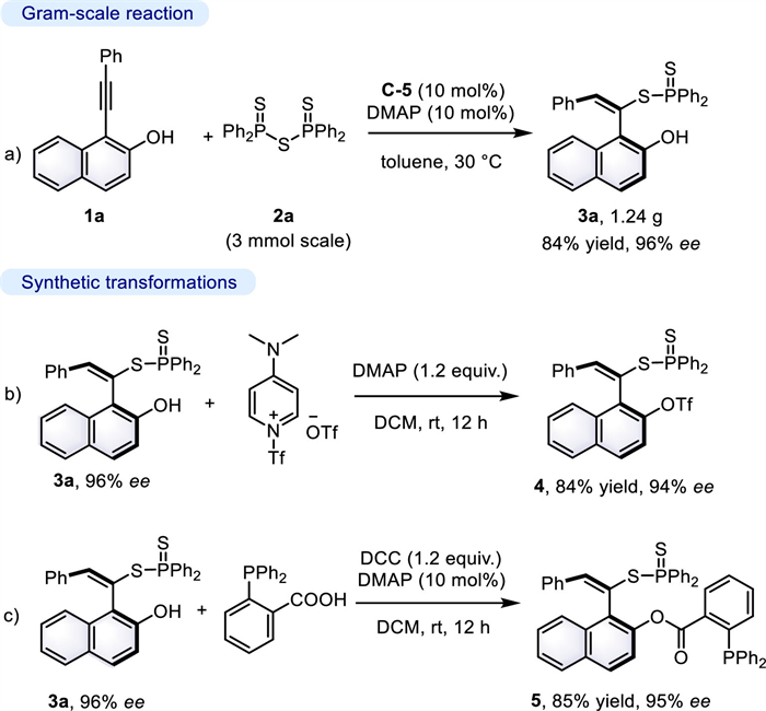 To demonstrate the utility of this protocol, a gram-scale reaction was performed on a 3 mmol scale under the standard reaction conditions (Scheme 1a), furnishing the desired product 3a maintaining the same level of yield and enantioselectivity (84% yield, 96% ee). Moreover, the trifluoromethanesulfonation of 3a could easily produce the synthetically useful triflate 4 in 84% yield with 94% ee (Scheme 1b). Furthermore, esterification of 3a with 2-(diphenylphosphaneyl)benzoic acid afforded axially chiral phosphine-containing styrene 5 (Scheme 1c).