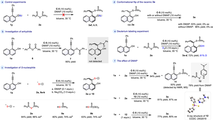 To gain further insight into the mechanism of this reaction, a series of control experiments were conducted (Scheme 2). O-Acyled substrate 1y generated no desired product 3af under the standard reaction conditions, indicating that OH group of o-alkynylnaphthol could play a crucial role in forming VQM intermediate (Scheme 2a). Interestingly, the reaction of 1a and benzoic anhydride 6 under the standard conditions only generated product 7, and no desired product 8 was generated from nucleophilic addition of VQM with the anhydride 6 as a nucleophilic reagent (Scheme 2b). To further explore the influence of nucleophiles, we conducted a series of experiments using various S-nucleophiles. The ee values of the resulting products exhibited significant variation, indicating that the nucleophilic attack on VQM may represent the enantioselectivity-determining step (Scheme 2c). The recovery of 93% of racemic 3a in the presence of catalyst C-5 excluded the possibility that the reaction initially produced racemic 3a, which was subsequently isomerized to one enantiomer under the influence of C-5 (Scheme 2d). Moreover, a deuterium labeling experiment with D2O in the reaction system gave the corresponding product with a 61% D-labelled ratio, suggesting that external trace amounts of water might provide proton for the generation of product (Scheme 2e). Besides the desired product 3a, this reaction between 1a (1.5 equiv.) and 2a (1.0 equiv.) generated byproducts including O-(1-(phenylethynyl)naphthalen-2yl)diphenylphosphinothioate 11 and pyridinium 12 which were identified by NMR, mass spectrometric and X-ray crystallographic analysis, indicating that excess phosphinothioic thioanhydride 1a could react as the electrophilic reagent to give 11 (Scheme 2f). Interestingly, the reaction with pyridinium 12 instead of DMAP under the standard reaction conditions also proceeded smoothly to afford product 3a in 81% yield with 97% ee, maintaining almost the same level of enantioselectivity, and treatment of 1a with pyridinium 12 (1.0 equiv.) in toluene at 30 ℃ produced 3a in 77% yield with 80% ee. This observation suggested that pyridinium 12 may serve as the true nucleophiles in the addition reaction. Moreover, the reaction without 1a under standard conditions also afforded pyridinium 12 (for details see Supporting information). The Hammett relationship was established for para-pyridine, allowing for a Hammett analysis to be performed on the nature of these substituents and their effect on asymmetric induction in the formation of 3a [54]. A linear plot of log(er) for 3a versus σp for para-pyridine was obtained, revealing a negative slope in the relationship between enantiomeric ratios and σp constants for 3a (Fig. S5 in Supporting information). This result indicates that the reaction might undergo an ionic transition state and the electron-donating effect of pyridine enhances the ionization of pyridinium salt.