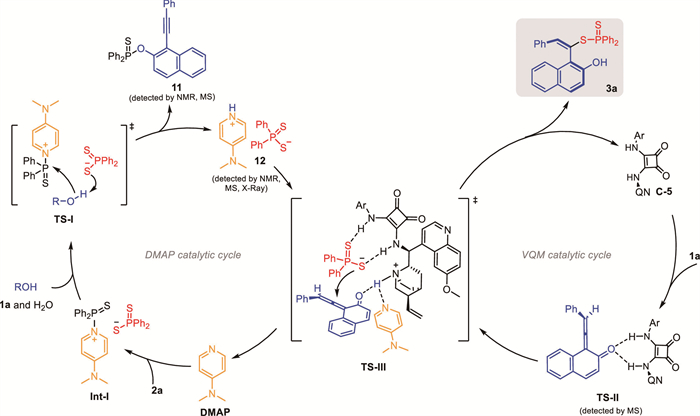 Based on the above experimental observations, a plausible mechanism was elucidated (Scheme 3). First, DMAP as a nucleophilic catalyst reacted with phosphinothioic thioanhydride 2a to produce the activated thiophosphoryl donor intermediate Int-I. Subsequently, 1a and H2O interacted with Int-I to generate pyridinium 12 and byproduct 11 through TS-I [55]. Meanwhile, the hydrogen-bonding interactions of 1a and cinchona alkaloid-derived squaramide catalyst C-5 could generate VQM intermediate. Concurrently, the proton of pyridinium 12 was neutralized by the quinine moiety of C-5. Then, C-5 efficiently guided nucleophilic addition with enantioselective control to the formation of TS-Ⅲ by the hydrogen-bonding interactions [56-59]. Finally, the nucleophilic addition and protonation of TS-Ⅲ led to axially chiral styrene 3a, together with catalyst C-5 and DMAP released into the catalytic cycle respectively.