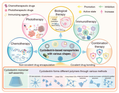 This review summarizes the recent advances in the development of CD-based nanotherapeutics for constructing drug delivery systems and enhancing cancer treatment. The unique structure and properties of CDs provide tremendous potential for the creation of efficient drug delivery systems. Moreover, chemical modifications based on CDs can be used to generate polymers with different structures and functions through chemical reactions. Both unmodified and modified CDs present intriguing prospects for formulating diverse multifunctional nanocarriers. Drugs can be effectively incorporated into CD through covalent or non-covalent interactions. The tailored design of CD-based NPs, endowed with desirable characteristics, facilitates their extensive utilization in various cancer therapies, including: (Ⅰ) Various antitumor agents, such as chemotherapeutic drugs, phototherapeutic agents, macromolecular agents, immune agents and other agents, can be integrated into CD-based NPs to build highly efficient therapeutic platforms. (Ⅱ) The utilization of CD-based NPs improves the solubility, stability and bioavailability of the encapsulated antitumor agents due to their superior biocompatibility and facile functionalization. (Ⅲ) Incorporating CD-based supramolecular assemblies for the functionalization of biomacromolecules, such as proteins, plasmids, and nucleic acids, effectively enhances their tumor-targeting ability and antitumor activity, presenting a promising strategy for cancer therapy. (Ⅳ) CD-based NPs with low toxicity and desirable loading capacity hold great potential as delivery systems for immune agents in constructing immunotherapy nanoplatforms.