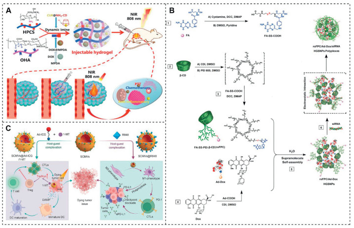 Figure 10. (A) Schematic representation of the composite hydrogel design for tumor therapy using NIR irradiation. Copied with permission [122]. Copyright 2023, Elsevier Ltd. (B) Schematic illustration depicting the formation process of roFPC/Ad-Dox HGSNPs, as well as the concept behind roFPC/Ad-Dox/siRNA HGSNPs polyplexes. Copied with permission [124]. Copyright 2022, Elsevier Ltd. (C) SCMV NPs are prepared for delivering therapeutic drugs in cancer immunotherapy. Copied with permission [126]. Copyright 2022, Elsevier B.V.The PTT can be combined not only with chemotherapy but also with PDT. Duy-Thuc Nguyen and colleagues reported a type of photobleaching-mediated charge-reversible NPs (P-ZWNIR NPs) that exhibit strong rectal tumor targeting and penetration capabilities [123]. NIR fluorophores and tumor-targeting moiety phenylboronic acid (PBA) were covalently linked to the CD core, resulting in the formation of P-ZWNIR CDs. By utilizing inclusion complexes formed between β-CD derivatives and the photosensitizer Pheo-Fc, P-ZWNIR NPs were constructed. Introduction of amphoteric ions within the CD units by heptamethine cyanine dye IR783 enables charge conversion through photobleaching, thereby enabling transformation of P-ZWNIR NPs into positively charged NPs upon irradiation with an 808 nm laser. Through extravasation and active targeting mechanisms, P-ZWNIR NPs enhanced tumor penetration, while their therapeutic efficacy for rectal cancer was further optimized by incorporating Pheo-Fc, making it a dual-functional agent specifically tailored for the combined photodynamic/chemodynamic therapy of rectal cancer.