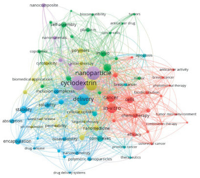 Cyclodextrins (CDs), a class of cyclic oligosaccharides obtained by enzymatic degradation of starch, are extremely versatile building blocks for the design of drug delivery systems (Fig. 1) [21-23]. Typical CDs can be categorized as α-, β-, and γ-CD based on the number of D-glucose units linked by α−1, 4-glycosidic bonds within a cyclic structure [24]. The CD interior is hydrophobic cavity, which is lined with carbons and ethereal oxygen of the glucose residues. The CD exterior has a large number of hydroxyls groups, leading to a hydrophilic surface [25]. CDs are therefore amphiphilic molecules owning a hydrophobic core and a hydrophilic shell. This property endows them with sufficient water solubility and the ability to serve as a host to accommodate a wide range of hydrophobic guest molecules within their cavity via host-guest interactions [26]. Additionally, the hydroxyl groups on the outer surface of CDs can be classified as primary hydroxyls located on the upper rim and secondary hydroxyls situated on the lower rim [27]. Therefore, CDs can be used to generate polymers with different structures and functions through chemical reactions. Furthermore, CDs possess prominent biocompatibility so that they do not elicit immune responses and have low toxicities [28]. These superior properties of CDs render them extensively employed in drug delivery systems [29]. For instance, the hydrophobic cavities of CDs can bind various water-soluble low molecular weight drug molecules through multiple non-covalent interactions, such as electrostatic interactions, van der Waals forces, hydrogen bonds, π-π interactions, and hydrophobic interactions. At the same time, the CD’s multiple intricate hydroxyl sites also facilitate the covalent attachment of drugs, enabling precise modulation of anticancer agents and achieving targeted regulation of drug release. Therefore, CD-based nanoparticles (NPs), when combined with a variety of drugs, can be effectively utilized to treat various types of tumors, including but not limited to breast cancer, colorectal cancer, lung cancer, liver cancer, bladder cancer and cervical cancer [30-33]. In recent decades, extensive research has been conducted on CD-based nanotherapeutics for diverse cancer therapy strategies due to their unique chemical structure and properties, yielding enhanced anticancer efficacy. The co-occurrence keywords of CD-based nanotherapeutics for tumor therapy over the past decade were visually presented by using the VOSviewer 1.6.20 software (Fig. 2) [34].