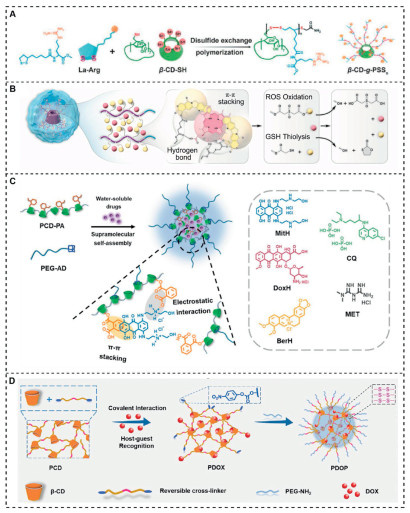 Figure 4 (A) Schematic illustration of the preparation of β-CD-g-PSSn. Reproduced with permission [46]. Copyright 2023, Wiley-Blackwell. (B) The schematic diagram of CDCPT and Ce6 integrating into nano-composite particles (CCNP) during the co-assembly process. Reproduced with permission [47]. Copyright 2023, Elsevier. (C) Construction of PCD-PA/PEG-AD supramolecular self-assembly. Copied with permission [55]. Copyright 2025 Elsevier Ltd. (D) Schematic illustration of GSH-sensitive supramolecular nanocage (PDOP NCs). Reproduced with permission [57]. Copyright 2023, Elsevier Ltd.