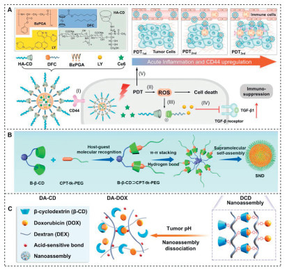 Yang et al. developed a supramolecular polymer nanodrug (SNP) [73], by covalently coupling the drug CPT to CDs through a chemical reaction between CD-NH2COOH and CPT-S-OH. The resulting monomer can achieve supramolecular self-assembly through host-guest interactions. To control the morphology of the self-assembly and enhance stability, they introduced CPT-PEG during the supramolecular self-assembly process, ultimately forming SNPs (Fig. 6B). This approach significantly improved the solubility of CPT and stimulated an anti-tumor immune response, promoting the infiltration of cytotoxic T lymphocytes within tumors, thereby enhancing the efficacy of tumor immunotherapy.